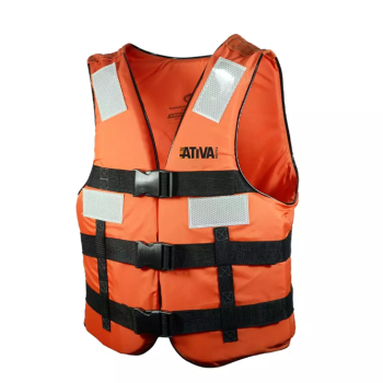 O colete jaleco da Ativa foi desenvolvido para uso em trabalhos de longa duração, realizados próximos à borda de embarcações, cais ou construções que apresentem risco de queda em águas calmas. Homologado pela Marinha do Brasil. Nº 050/2011. Desenvolvido e fabricado de acordo com a NORMAM 05/DPC. Fabricado com tecido poliéster grosso e espuma de polietileno de célula fechada, que garantem uma flutuabilidade de 90N. Acabamento em vinil preto para maior conforto e durabilidade, ombreiras reforçadas com costura em X. Conta com fitas refletivas Solas, tirantes de polipropileno para ajuste na cintura e peito e 3 fechos acetal 40mm para ajuste de cintura e peito.